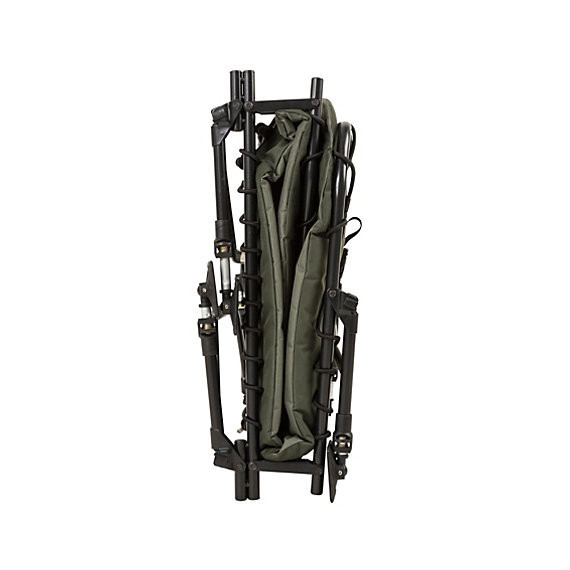 - Doppelscharnier-System, um im ausgeklappten Zustand ein flaches Bett und im zusammengeklappten Zustand einen Platz für einen Schlafsack zu schaffen, der während des Transports am Bedchair befestigt werden kann.