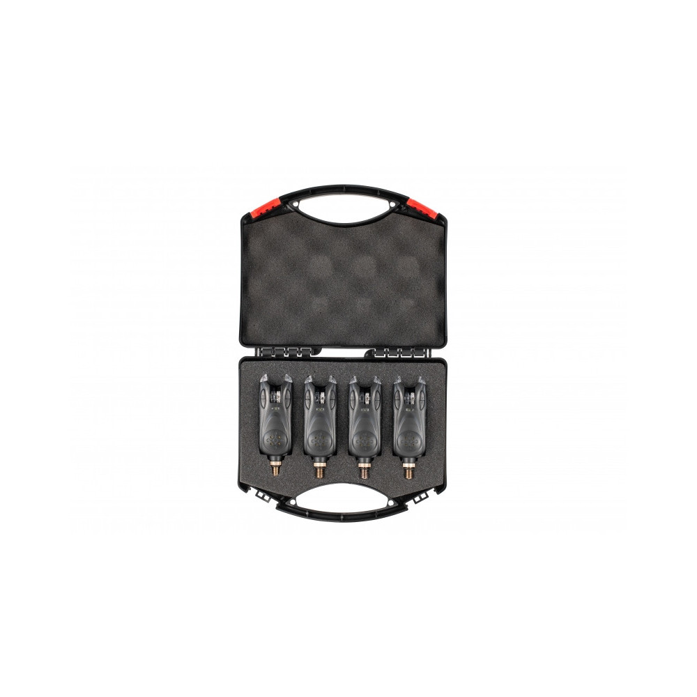 Starbaits 4 Ruten Bite Indicator Set mit Bissanzeigern, die über alle notwendigen Funktionen verfügen, um allen Bedingungen gerecht zu werden (Strömung, Wind, Bootsangeln, Regen...).