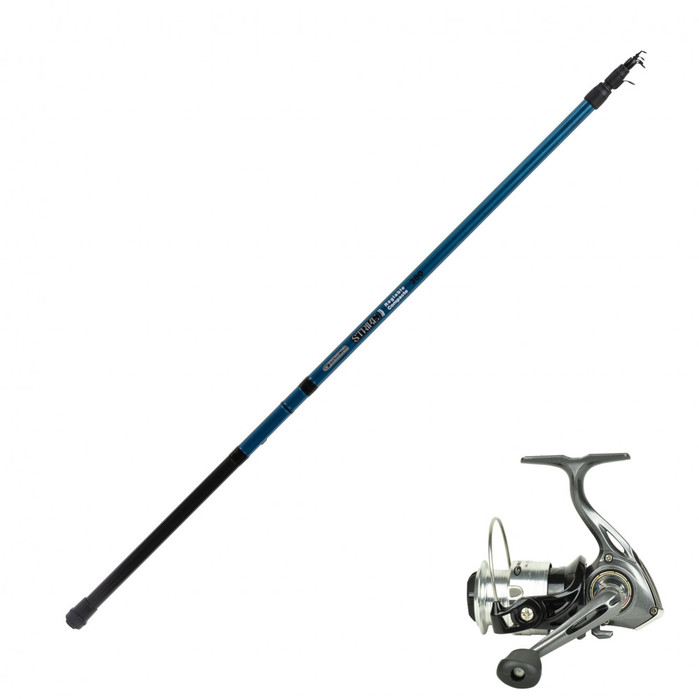 Set für das Angeln auf Forellen mit Tock, bestehend aus einer Agility 3.8(2.25 bis 3.8m), 5-teiligen Rute und einer Strike RC-Rolle.