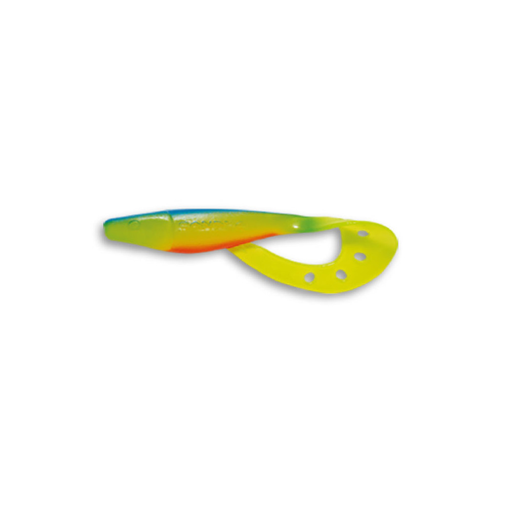 Der Köder mit dreieckigem Querschnitt hat die außergewöhnliche Aktion eines Kommas und eines Shads. Sein pisciforme Körper erinnert perfekt an einen Fisch und sein sichelförmiger Schwanz erzeugt starke niederfrequente Vibrationssignale, die visuell den Eindruck eines Doppelschwanzes erwecken.