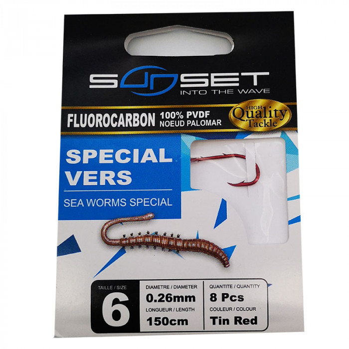 Die HM RS COMPETITION SPECIAL Wurm / FLUORO montierten Haken haben ein 1,50m langes Stack aus 100% PVDF Fluorocarbon, das mit einer Schlaufe für eine schnelle Befestigung versehen ist. Das 100% PVDF Fluorocarbon ist unter Wasser völlig unsichtbar und bietet einen ultra diskreten Ansatz für die misstrauischsten Fische. Es verhindert auch das Verdrehen in starken Strömungen oder Wellen. Die Haken werden mit einem extrem starken Palomar-Knoten montiert, sind umgedreht und mit einer Öse versehen. Sie haben eine sehr starke und scharfe Spitze und 2 Mikrodornen am Schaft, die den Köder perfekt halten. Die Haken haben außerdem eine glänzende TR Zinn / rote Beschichtung, die ideal für das Angeln im Meer ist. Die SUNSET HM RS COMPETITION SPECIAL Wurm / FLUORO Meeresangelhaken sind mit hochwertigen Komponenten ausgestattet, damit Ihr Angeln ein voller Erfolg wird!