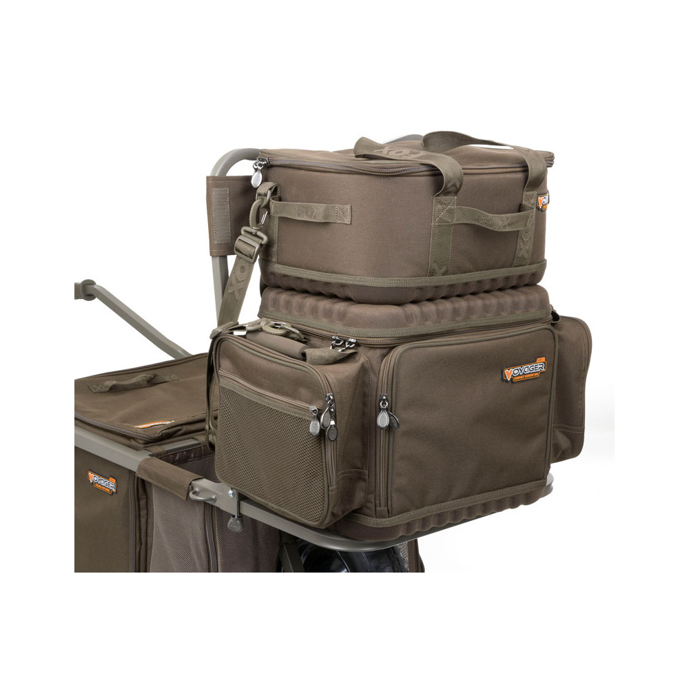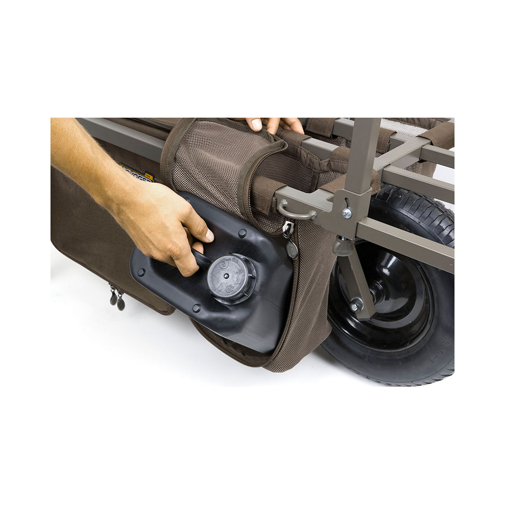 - Hauptunterschiede zum Standardmodell: Längere abnehmbare ergonomische Griffe, breitere Fächer und Netzfächer auf beiden Seiten des Rads, die mit Wasserkanistern kompatibel sind. Der vordere Rahmen des Trolleys ist verstellbar, sodass 2 x Low Level Bag oder 1 x Low Level Bag und 1 x Compact Barrow Bag darauf verstaut werden können. Wird mit einer Tasche "Voyager under barrow bag" geliefert.
