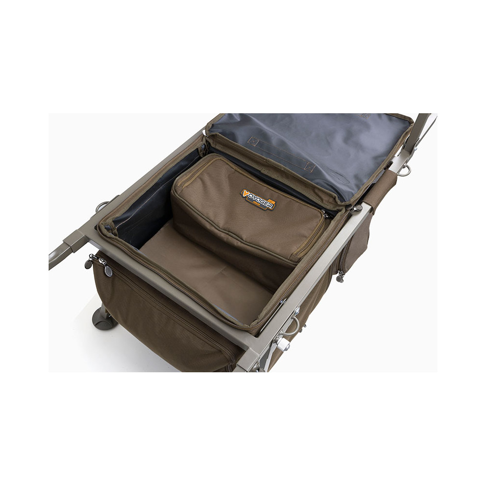 - Ausgestattet mit einer ausziehbaren vorderen Plattform, um die Taschen zu verstauen und den gesamten Platz in der Mitte für einen Bedchair und andere große Ausrüstungsgegenstände zu nutzen. Lässt sich vollständig unter den Trolley schieben, wenn Sie am Abend oder schnell fischen wollen und die Taschen mit dem Gesicht nach unten auf der Innenseite des Trolleys verstauen möchten. Der Wagen bleibt in beiden Konfigurationen ausbalanciert.