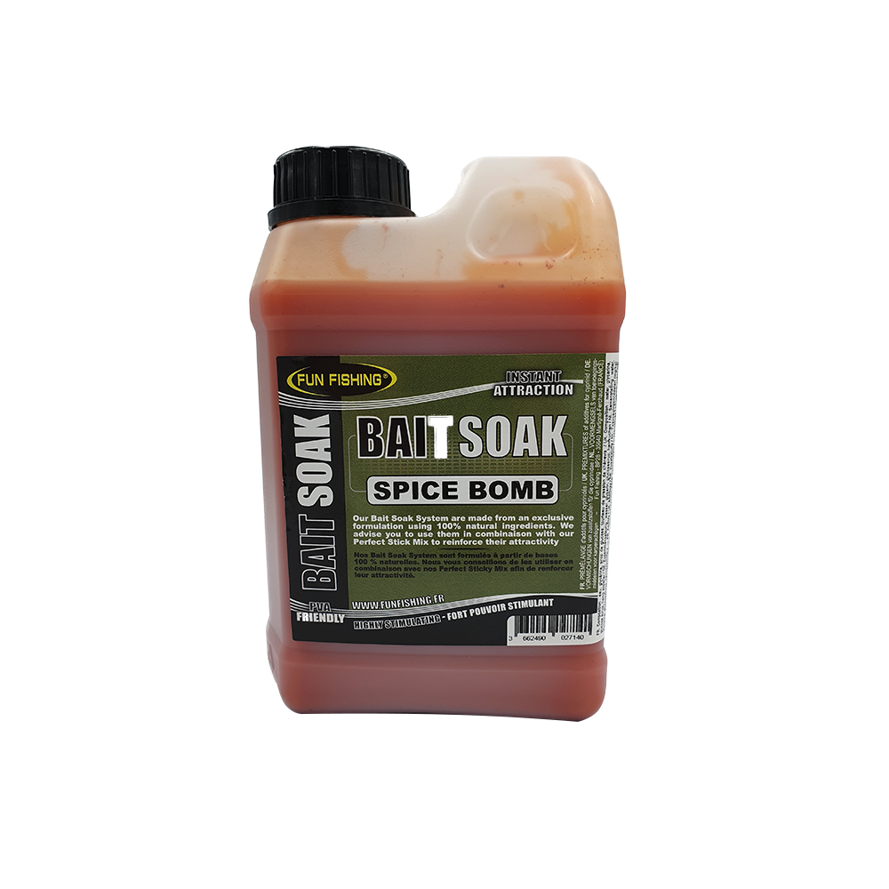 Bait Soak son bases líquidas formuladas a partir de ingredientes altamente atractivos. Se pueden utilizar como cobertura de las semillas o los gránulos. Al ser compatible con el PVA, puede sumergir sus palos directamente en nuestro Bait Soak. Sabor: Bomba de especias