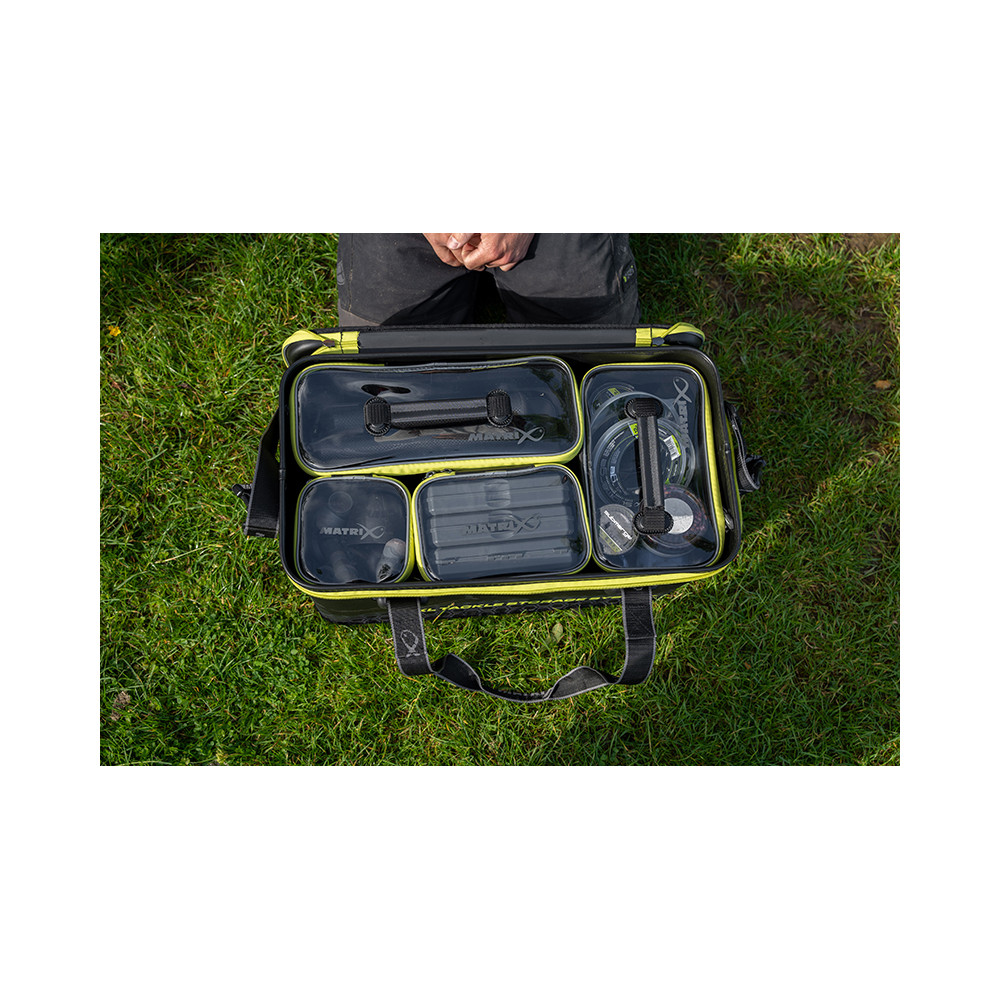 Se suministra con 6 bolsas interiores con tapas transparentes Desarrollado como un sistema modular para ayudarle a mantener sus aparejos organizados. Ideales para guardar accesorios, comederos y cajas de señuelos. Fabricadas en EVA resistente con costuras termoselladas. La tapa moldeada evita que el agua se filtre en la bolsa. Asas de transporte y correa para el hombro extraíble. Pies moldeados para evitar el desgaste. Bolsa principal XL y bolsas más pequeñas disponibles por separado. Dimensiones: 550 x 300 x 285 mm. Material principal 100% EVA / Tapas transparentes 100% PVC.