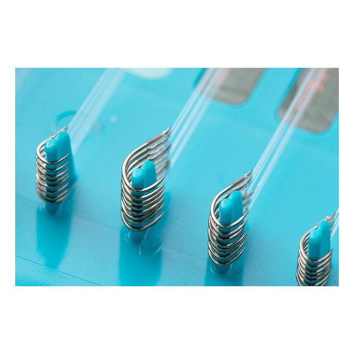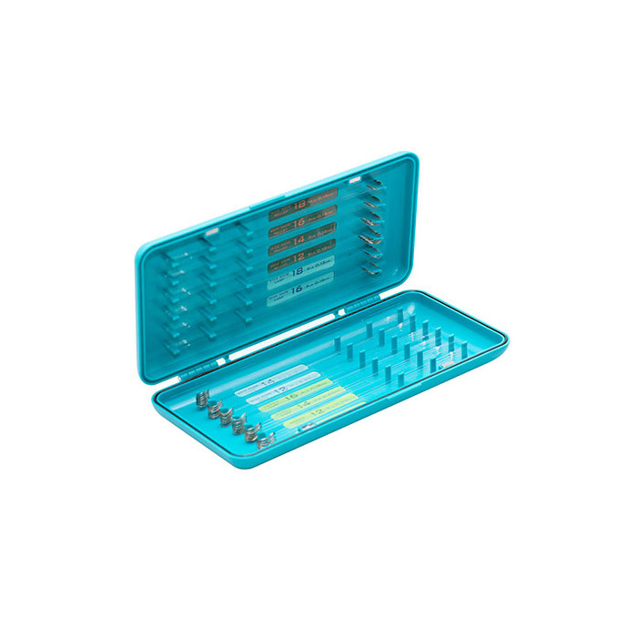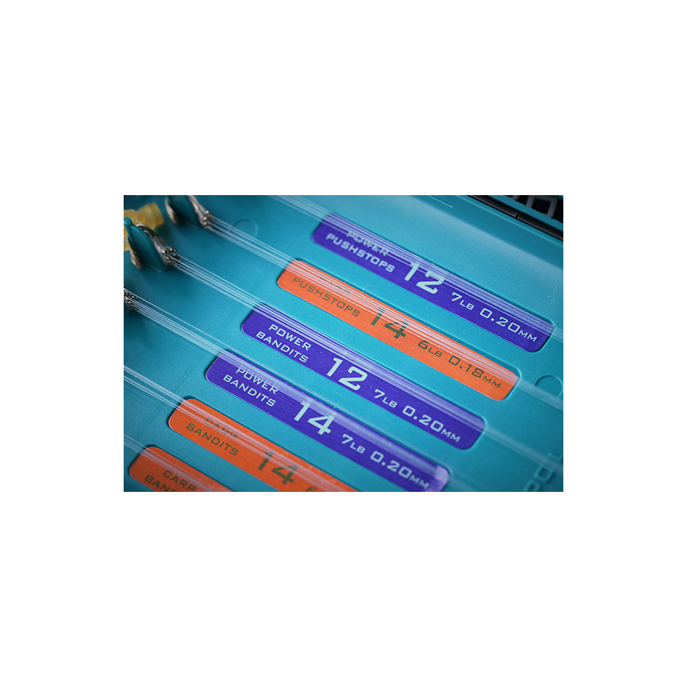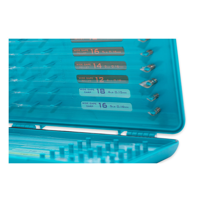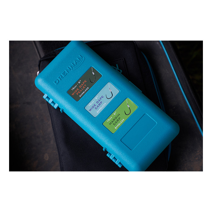 La caja del gancho tiene cierres magnéticos y un sello para evitar la entrada de agua. Cada caja se suministra con pegatinas en blanco para la identificación del anzuelo y la línea para los pescadores que deseen colocar sus propios tramos de anzuelos. Para mayor comodidad, toda la gama de ganchos para pértiga Drennan a los ganchos de nylon se transfieren fácilmente de sus placas a la caja y se suministran con pegatinas de identificación codificadas por colores.