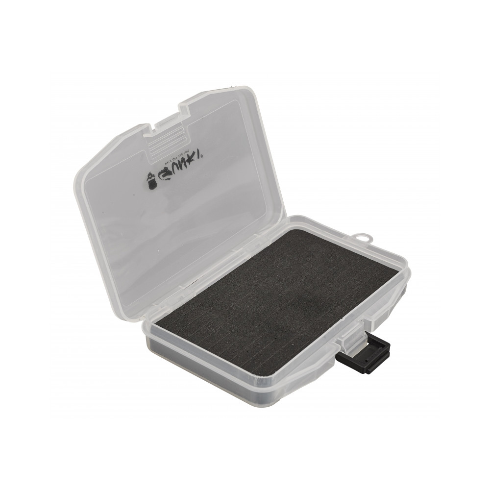 Caja transparente y ultraplana que se desliza fácilmente en un bolsillo. Su fondo está recubierto de una placa de EVA de alta densidad (dividida en diez filas, espaciadas cada 8 mm) para sujetar sus cucharillas y pequeños señuelos. Muy práctico. También dispone de un ojal externo para fijar un cordón de seguridad.