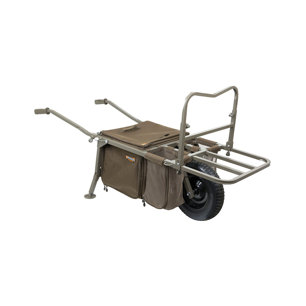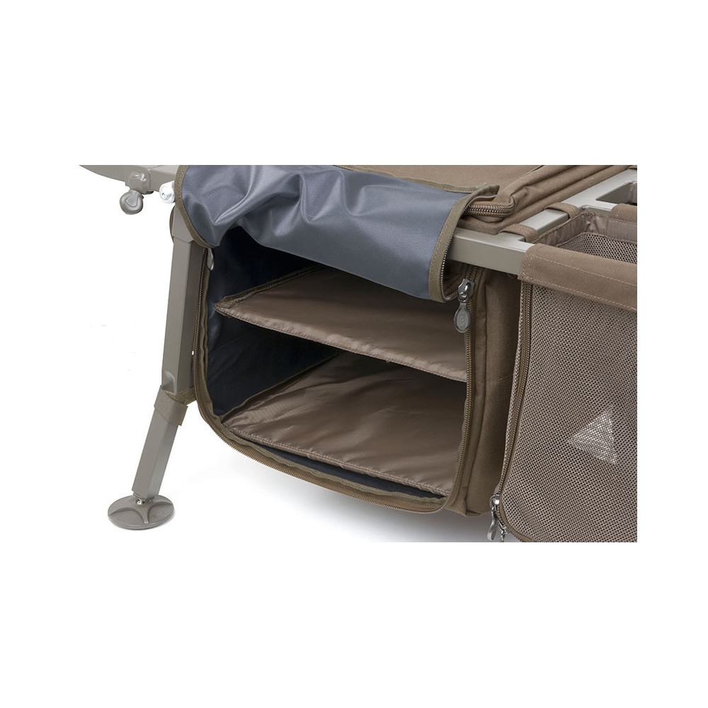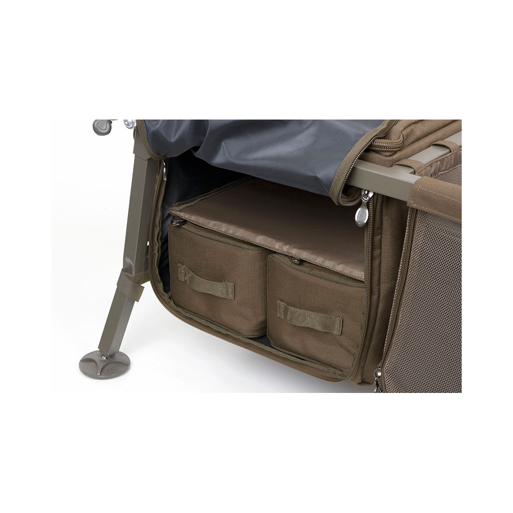 - Equipada con una plataforma delantera extensible para sujetar bolsas y utilizar todo el espacio central para sillas de cama y otros equipos de gran tamaño. Totalmente retráctil bajo el carro para las tomas nocturnas y la pesca rápida, donde las bolsas se pueden guardar boca abajo en el interior del carro. El carro permanece equilibrado en ambas configuraciones.