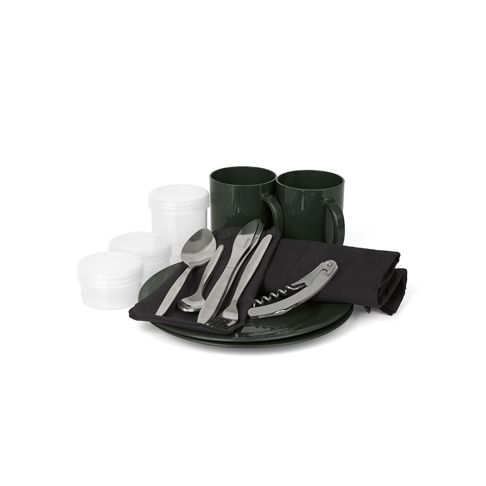 Juego de cocina Fox para 2 personas con su bolsa de almacenamiento, perfecto para sus sesiones de pesca en familia o con amigos.