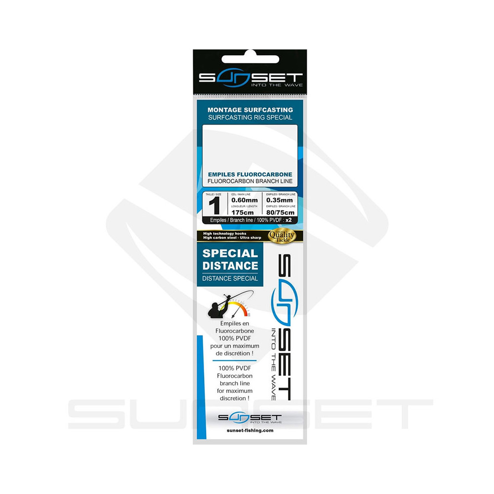 Las líneas SURFCASTING RS COMPETITION SPECIAL LONG DISTANCE / FLUORO 2 EMPILES están equipadas con un eslabón giratorio en la parte superior del cuerpo de línea para engancharlas rápidamente a su mosquetón. Un gancho de plomo en la parte inferior de la línea le permite cambiar rápidamente el peso del plomo en función de las condiciones de pesca. Equipado con 2 cañas de fluorocarbono de 80 y 75 cm montadas sobre eslabones giratorios fijados entre 2 perlas, perlas flotantes en ambas cañas para despegar su cebo y anzuelos de caña larga en Níquel Negro para evitar la corrosión. Los aparejos SURFCASTING SPECIAL LONG DISTANCE / FLUORO 2 STACK le permitirán buscar hermosos peces a larga distancia. Los anzuelos sujetan las puntas y los cebos a lo largo del cuerpo de línea haciendo que el aparejo sea más aerodinámico. Estos aparejos tienen puntas de fluorocarbono 100% PVDF que son totalmente invisibles bajo el agua ofreciendo un acercamiento ultra discreto incluso para los peces más recelosos. También evita el spinning en corrientes fuertes. Los aparejos SUNSET SURFCASTING RS COMPETITION están construidos con componentes de alta gama para que tus salidas de pesca sean un verdadero éxito. Con una longitud total de 175 cm, los bajos de línea SUNSET SURFCASTING SUNSET RS COMPETITION SPÉCIAL LONGUE DISTANCE / FLUORO 2 EMPILES están disponibles con anzuelo n°1.
