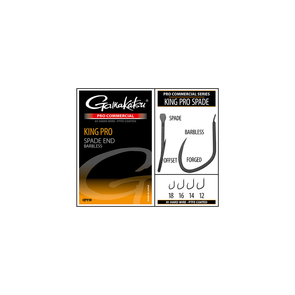 La punta de pala King Pro se basa en el modelo original Gamakatsu 2210, famoso en toda Europa por su excelente agarre gracias a su punta curvada y desplazada. Esta versión sin púas en alambre A1 no es una excepción, especialmente cuando el anzuelo necesita ser presentado ligeramente por encima de la profundidad en la caña o con una cola larga cuando se utilizan tácticas de feeder, este modelo es la preferencia de muchos pescadores de élite. Este modelo de línea media permite una presentación bastante sensible del cebo y, gracias al acero forjado, se ha añadido potencia extra. El revestimiento P.T.F.E. mejora la velocidad de penetración y mantiene la punta ultra afilada. El King Pro Spade End puede utilizarse tanto en la caña como en el cebador para pescar bremas, tencas, f1 y carpas de tamaño equivalente.