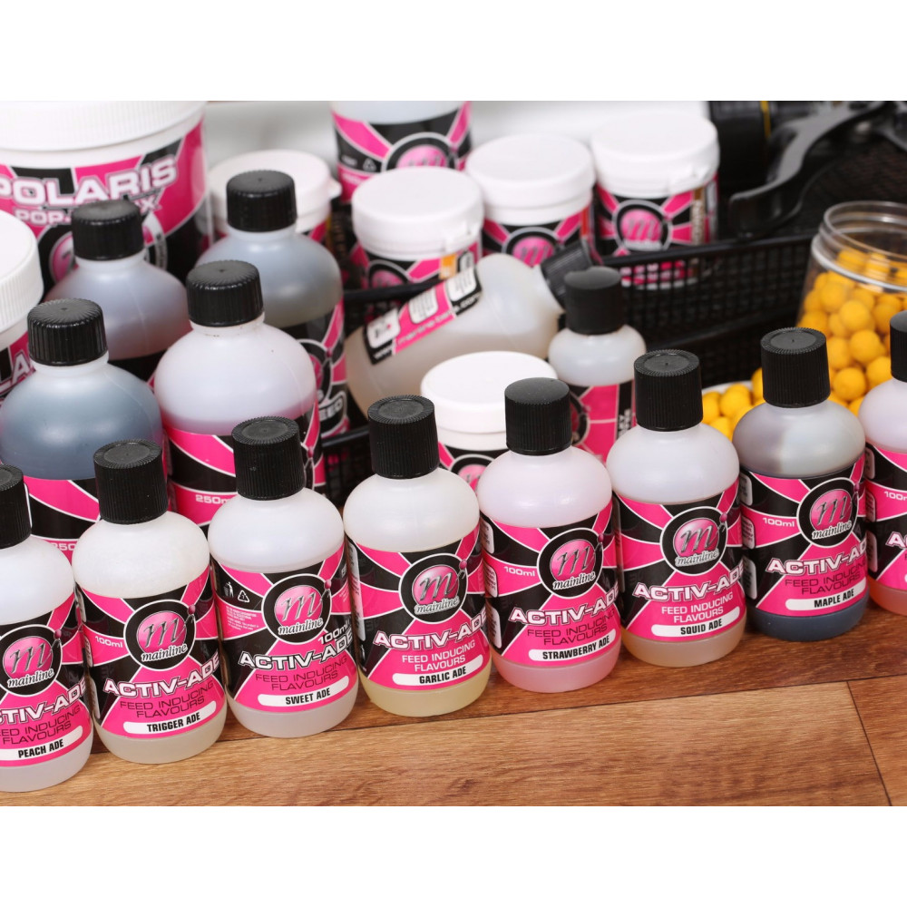 Activ-Ades, otro de los productos estrella de Mainline, son sabores estimulantes del apetito, resultado de una combinación de atrayentes a base de aminoácidos, potenciadores del sabor y estimuladores. Importados de Estados Unidos, se utilizan en la industria de la alimentación animal como catalizadores para actuar sobre los sensores químicos que regulan el hambre. Todos los productos de esta gama son extremadamente solubles en agua, característica que les permite difundirse muy rápidamente y, por tanto, acelerar sus efectos en la dieta de la carpa. Estos productos nos han permitido aprovechar nuestra experiencia en la atracción de carpas.