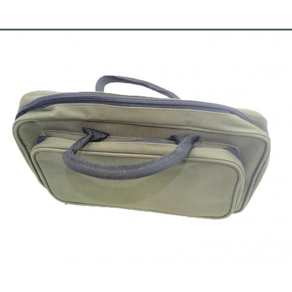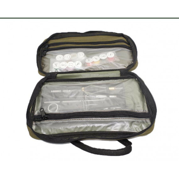 Maletín para guardar el material de montaje de moscas, con tornillo de banco. Con bolsillo frontal (ranura para vicios). Este maletín tiene bolsillos interiores transparentes para ver el contenido.