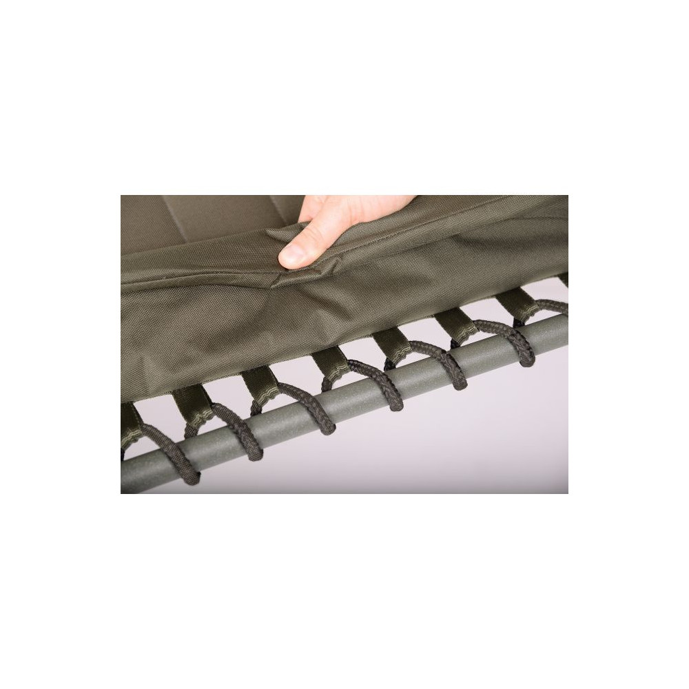 Le système de clips sur le cadre assure une structure solide, tandis que l’espace entre les pieds offre une position de couchage plus haute, réglable entre 35 et 55 cm. Sa structure dense et tendue améliore encore le confort, pour un repos optimal entre deux sessions de pêche.