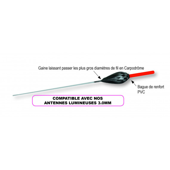 Flotteur doté d’une antenne de 3mm assurant une exCellente visibilité. Celle-ci est montée dans un insert plastique renforçant considérablement la solidité générale du flotteur. Sa forme poire lui octroie une exCellente tenue à la vague.