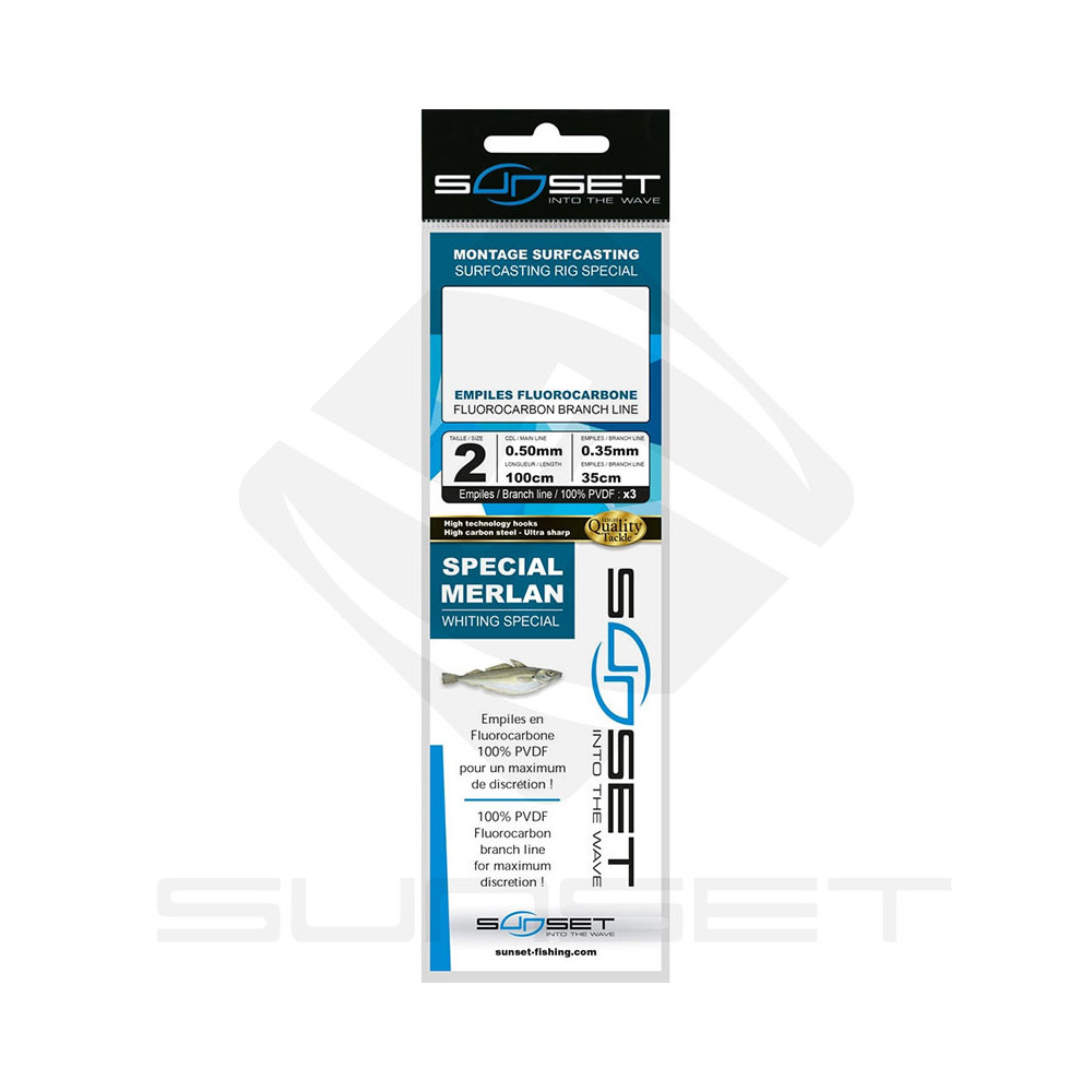 D’une longueur totale de 100cm, les bas de ligne SUNSET SURFCASTING RS COMPETITION SPECIAL MERLAN / FLUORO 3X35 sont disponibles en hameçon numéro 2.
