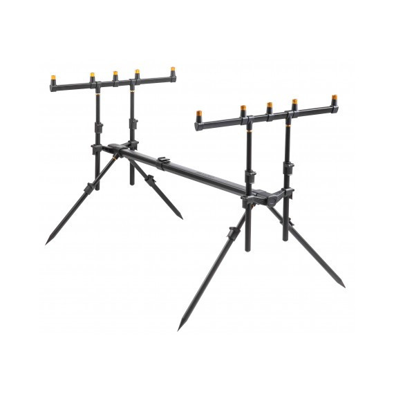 Support pour 3 ou 4 cannes, structure en aluminium, barre centrale extensible, pieds ajustables. Vendu avec sac de transport.