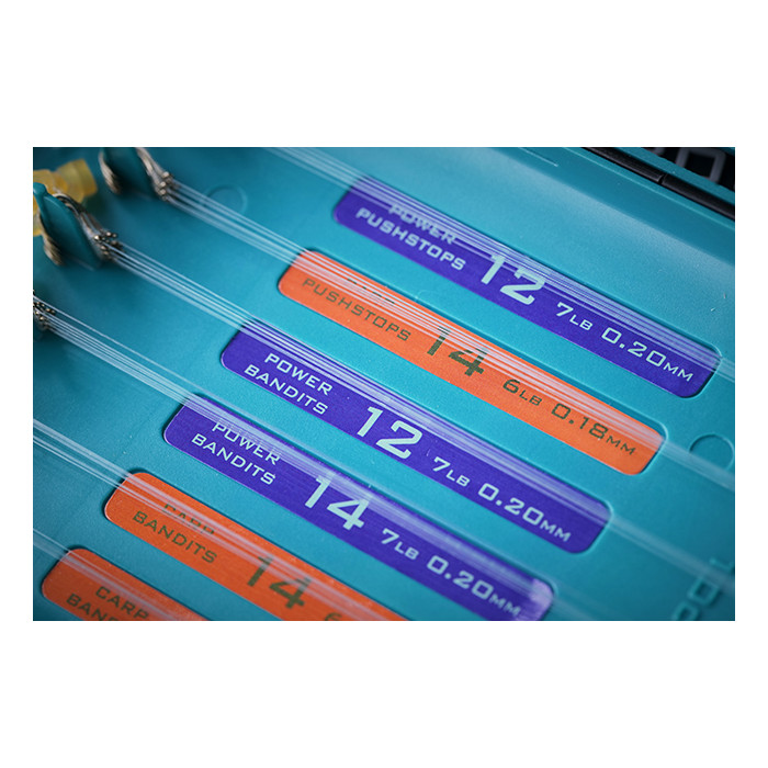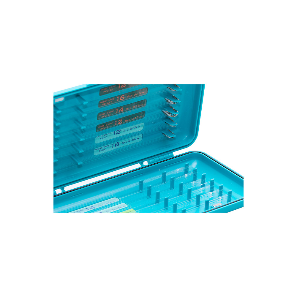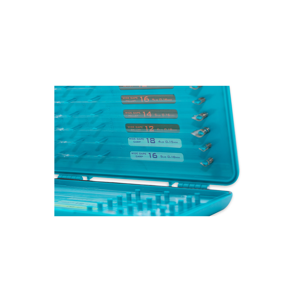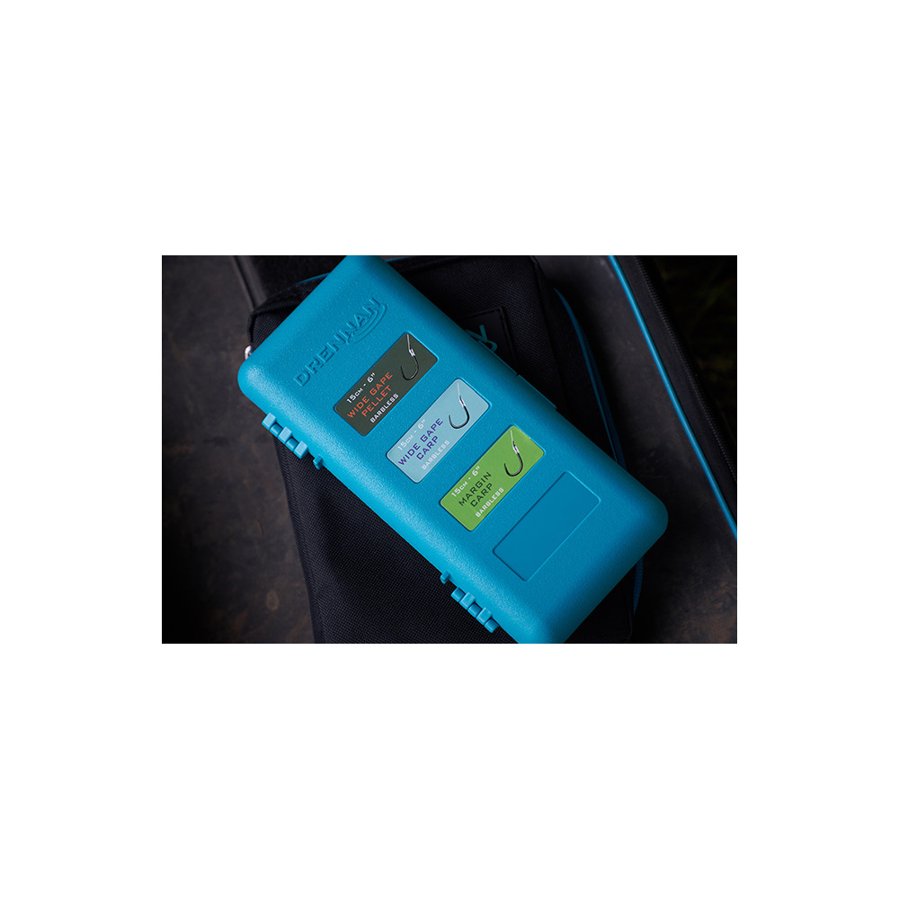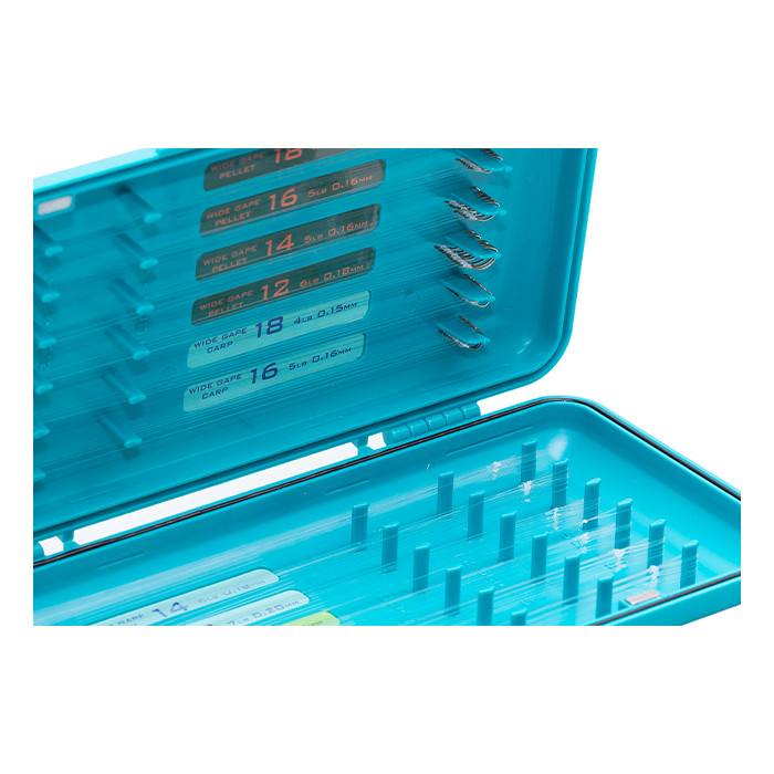The hook box is equipped with magnetic latches and a gasket to prevent water ingress. Each box is supplied with blank hook and line identification stickers for anglers wishing to attach their own lengths of hooks. For added convenience, the full range of Drennan Pole Hooks to Nylon hooks are easily transferred from their plates to the box and are supplied with color coded identification stickers.