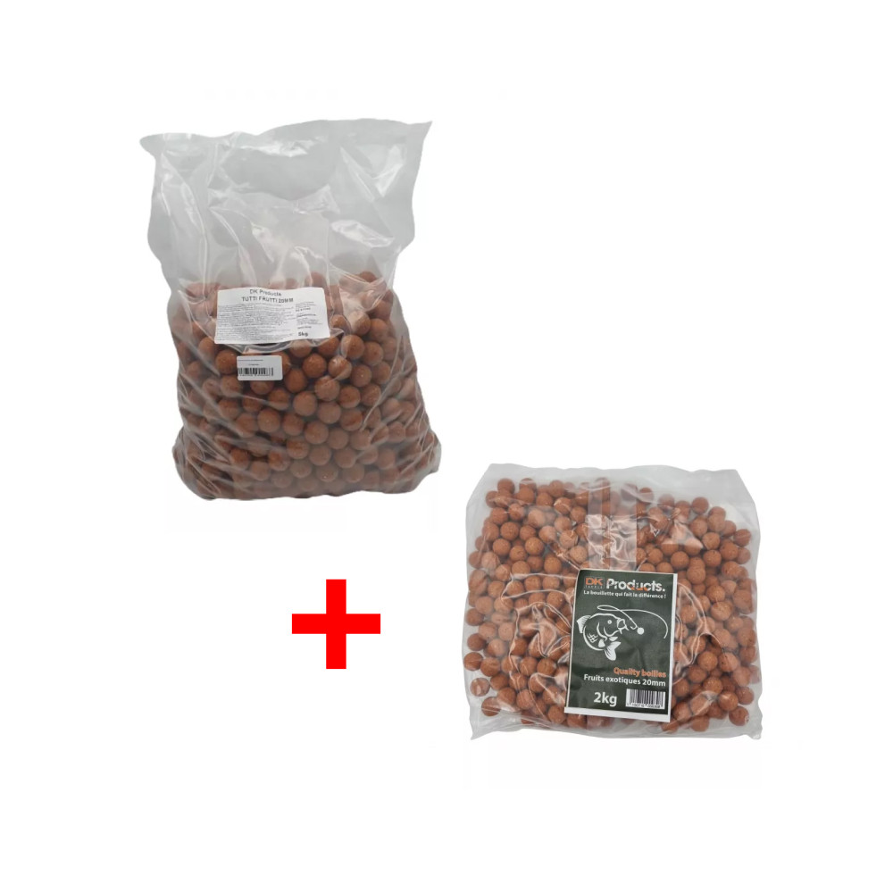 Pack containing 5kg of Tutti-Frutti 20mm DK PRODUCT boilies and 2kg of DK Product Quality Fruits Exotiques 20mm boilies.