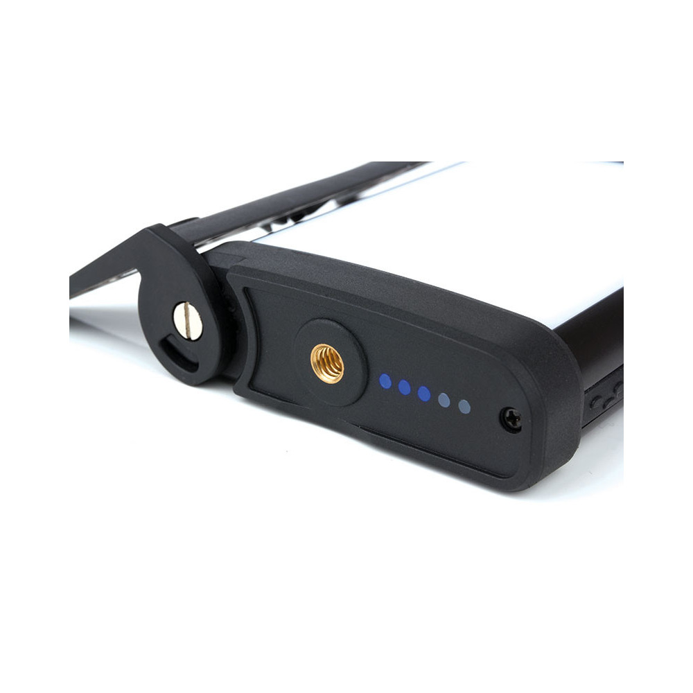- There is a bar of 5 blue LEDs. The first four indicate the level of Charge (4 lit for maximum level), and the fifth lights up when solar recharging is in progress