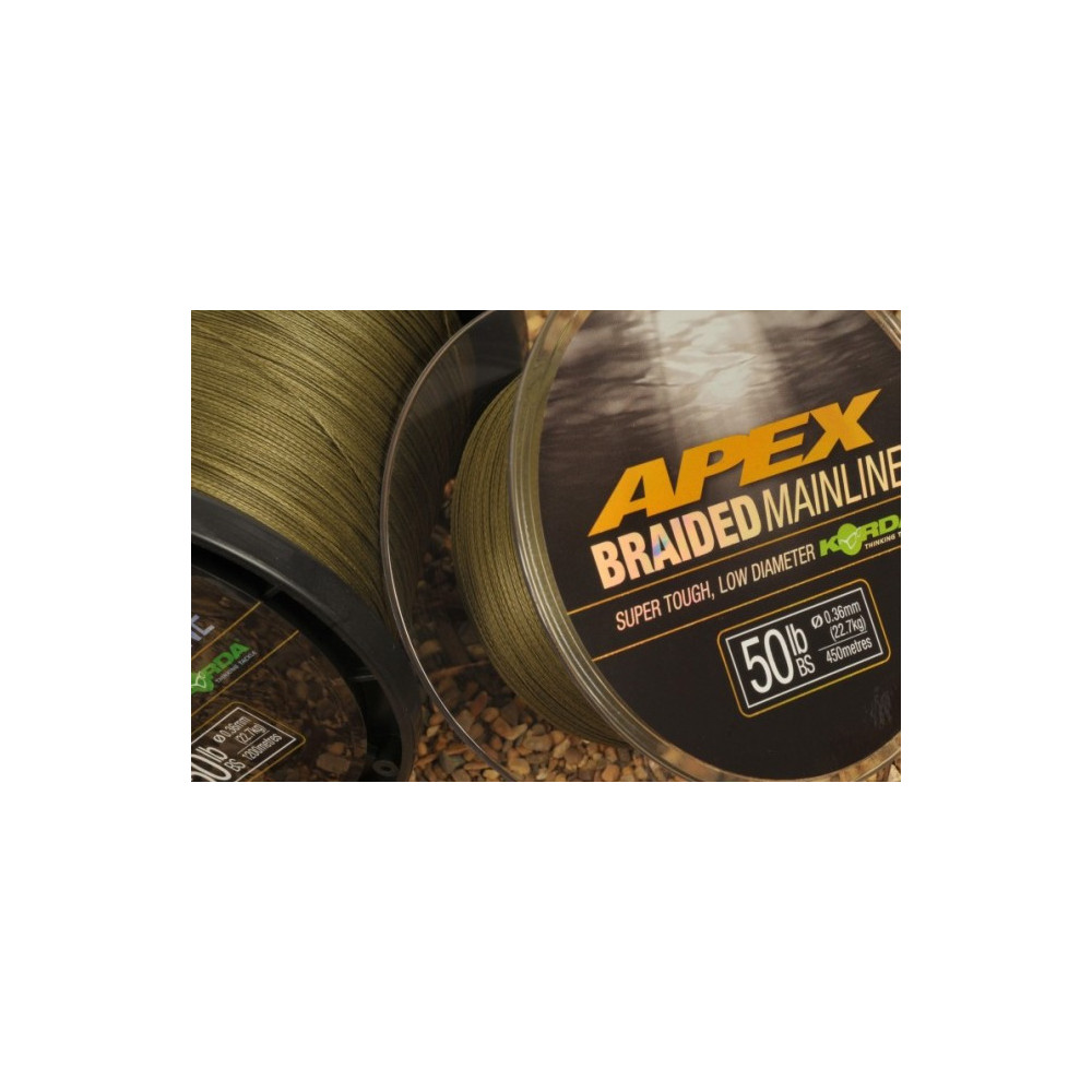 The Apex is braided in eight strands with PE fibers. We have long wondered if we were going to launch such a product on the market. Once the decision was made, we wanted a high quality product that met the expectations of carp anglers. We are proud of the result. Our team tested this braid across Europe on rivers like lakes. It is available in 0.23mm (30lb / 13.6kg) and 0.36mm (50lb / 22.67kg) in 1200m and 450m spools. The 450m spool fills a Daiwa 5000 reel. As with all spools of Korda line, it is marked every 250 meters to show you how much braid you have emptied on your reel and how much braid is left on the spool. Its green color will allow you to blend in with all the biotopes and bottoms of your lakes and rivers.