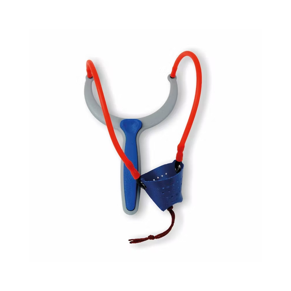 Slingshot with strong elastics and medium size bucket with plastic holder. Spare elastics included.