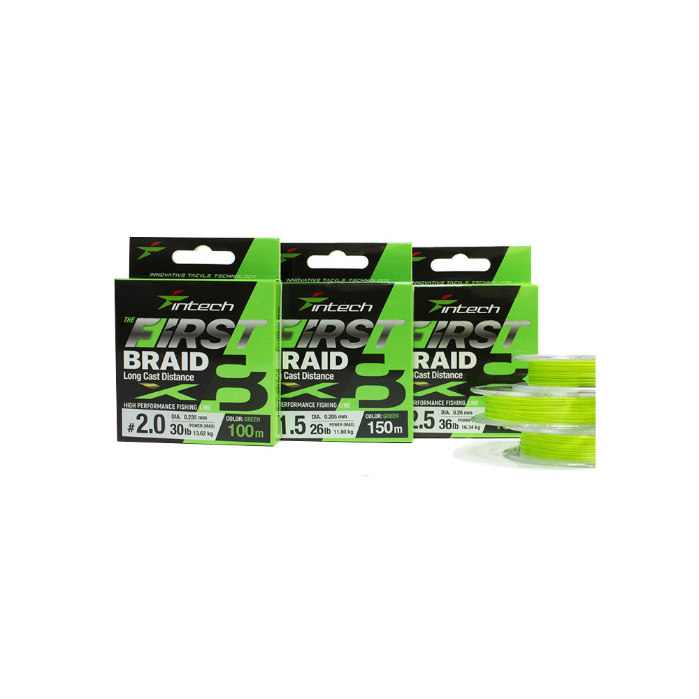 Ontworpen om een nieuwe hoge kwaliteitsstandaard in visdraad te zetten. Het heeft een extreem gladde coating en een verhoogde breukbelasting. Intech First PE X8 opent nieuwe mogelijkheden voor vissers op het vlak van gevoeligheid, bereik en kracht. Met zijn betaalbare prijs zal de First PE X8 zeker in de smaak vallen bij veel visliefhebbers.