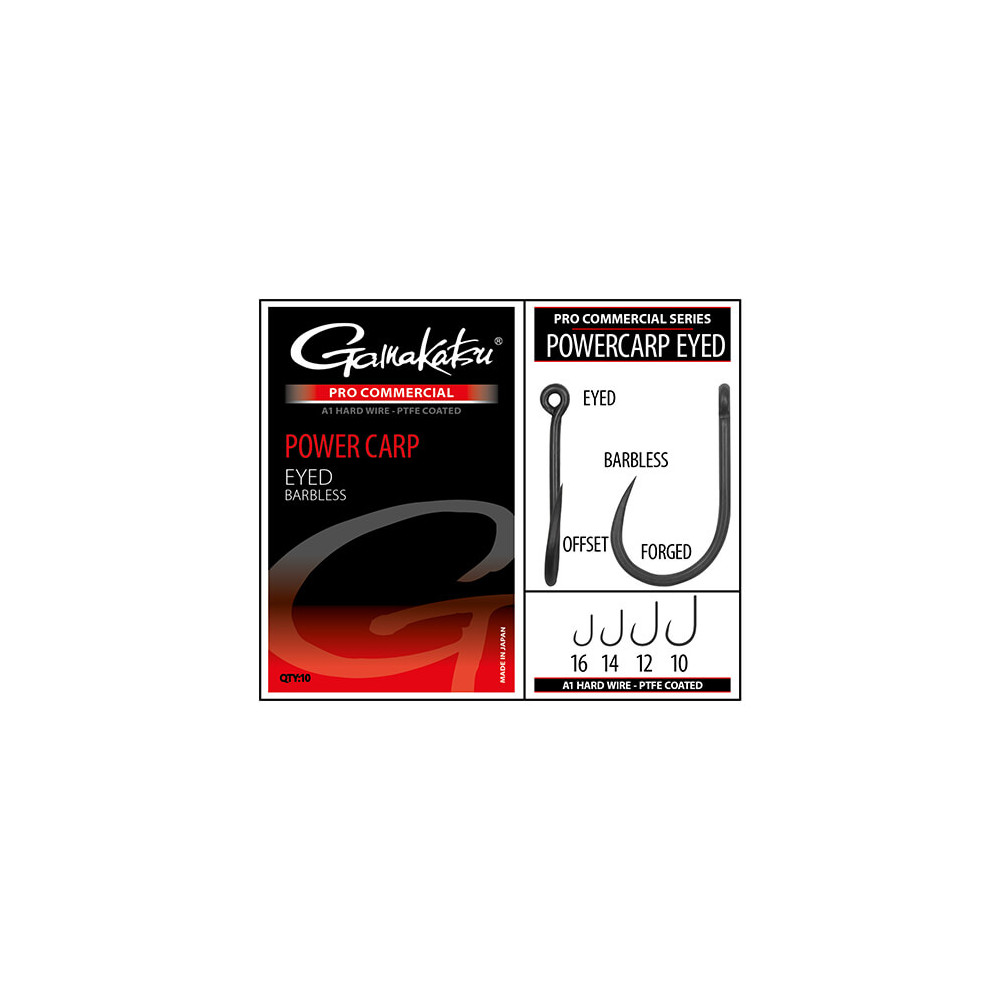 De originele Gamakatsu Power Carp Eyed haak staat bij veel vissers bekend als de ideale haak om mee te zamelen. De ronde kromming en de uitgekiende lengte van de punt zorgen ervoor dat er maximale druk wordt uitgeoefend op de gehaakte vis. Dit maakt het de ideale haak voor zware bungee rigs in combinatie met een afzuigsysteem. Dankzij het oogje kan deze haak gemakkelijk met een hair worden gebonden. Hard aas kan dus gebruikt worden in combinatie met een baitband, stopper of lariat. De verspringende, licht gebogen punt en de P.T.F.E.-coating zorgen voor een zeer hoge penetratiesnelheid. De geforceerde bochten en de licht verhoogde draaddiameter geven deze haak ultieme sterkte voor het snel en veilig haken van vis. De Power Carp Eyed kan worden gebruikt voor zowel het vissen met de hengel als met de feeder op karper en andere sterke vissoorten.