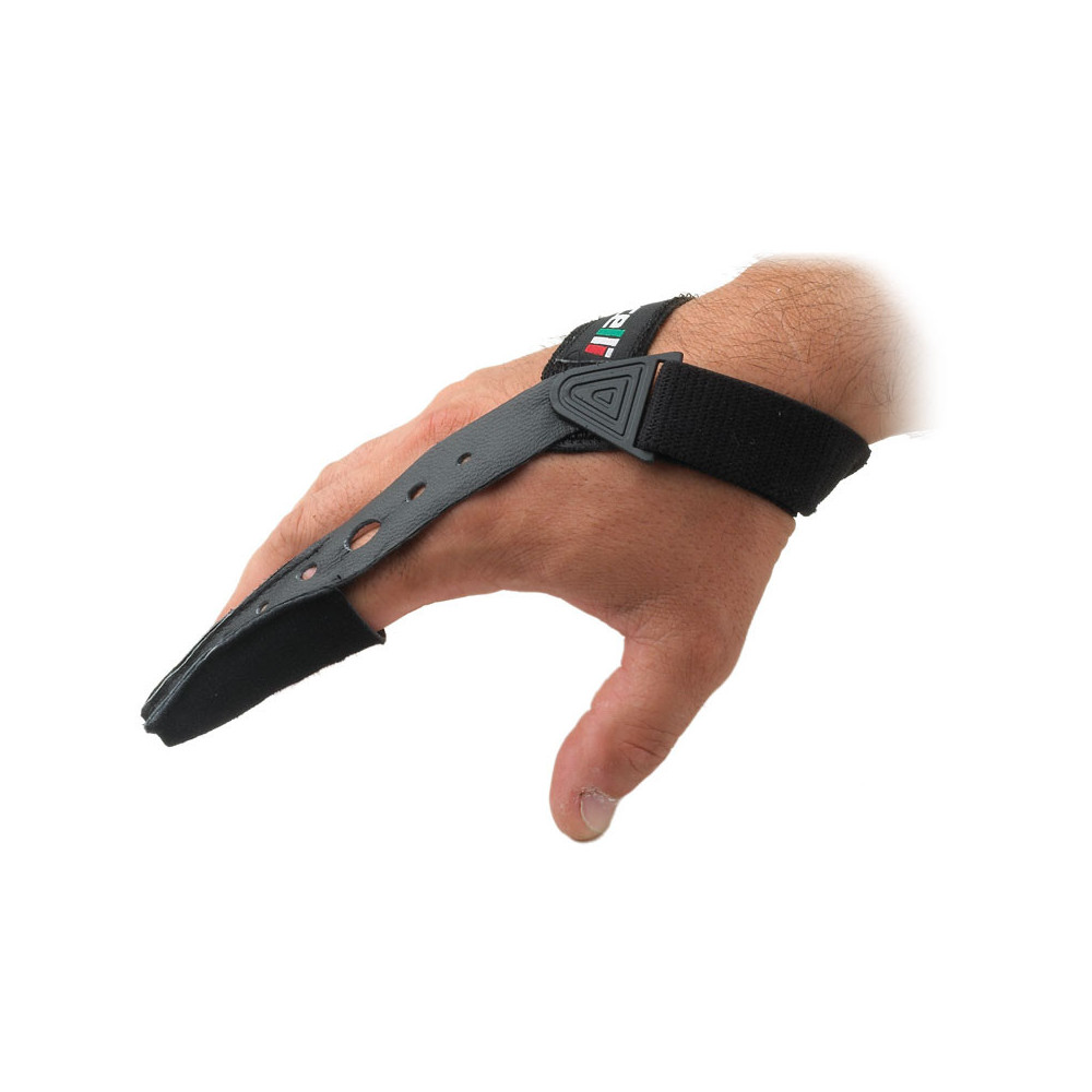 Lederen vingerbeschermer met verstelbaar polsriempje.