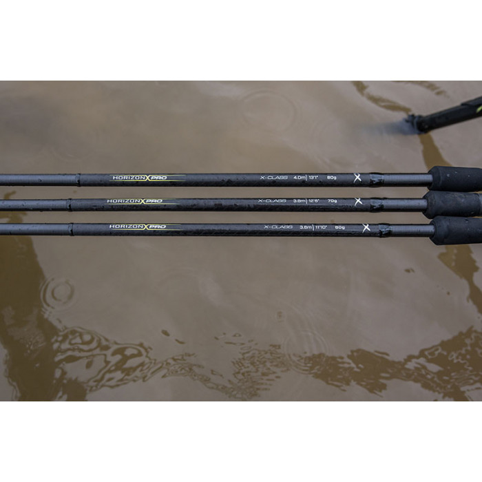 - Drie hengels in de Horizon X-klasse, 3,6m, 3,8m en 4,0m.