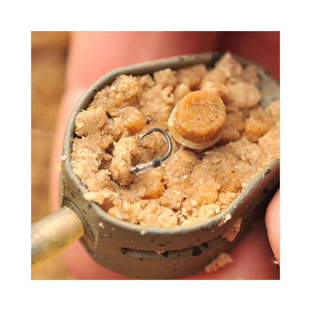 Om hem te laden, drukt u er gewoon pellets in met uw duim, legt u uw aas erop en voegt u er met minder druk nog een paar pellets aan toe.
