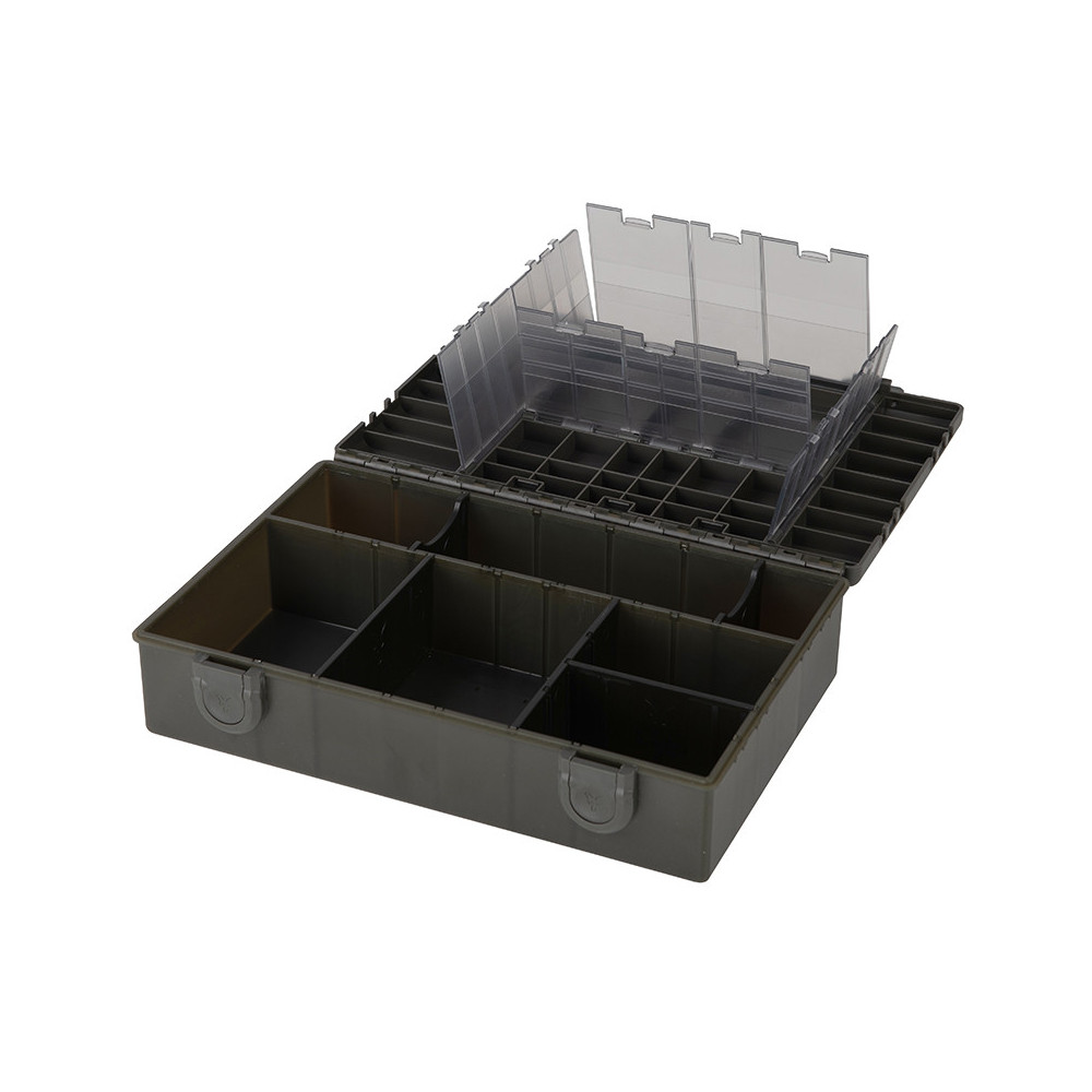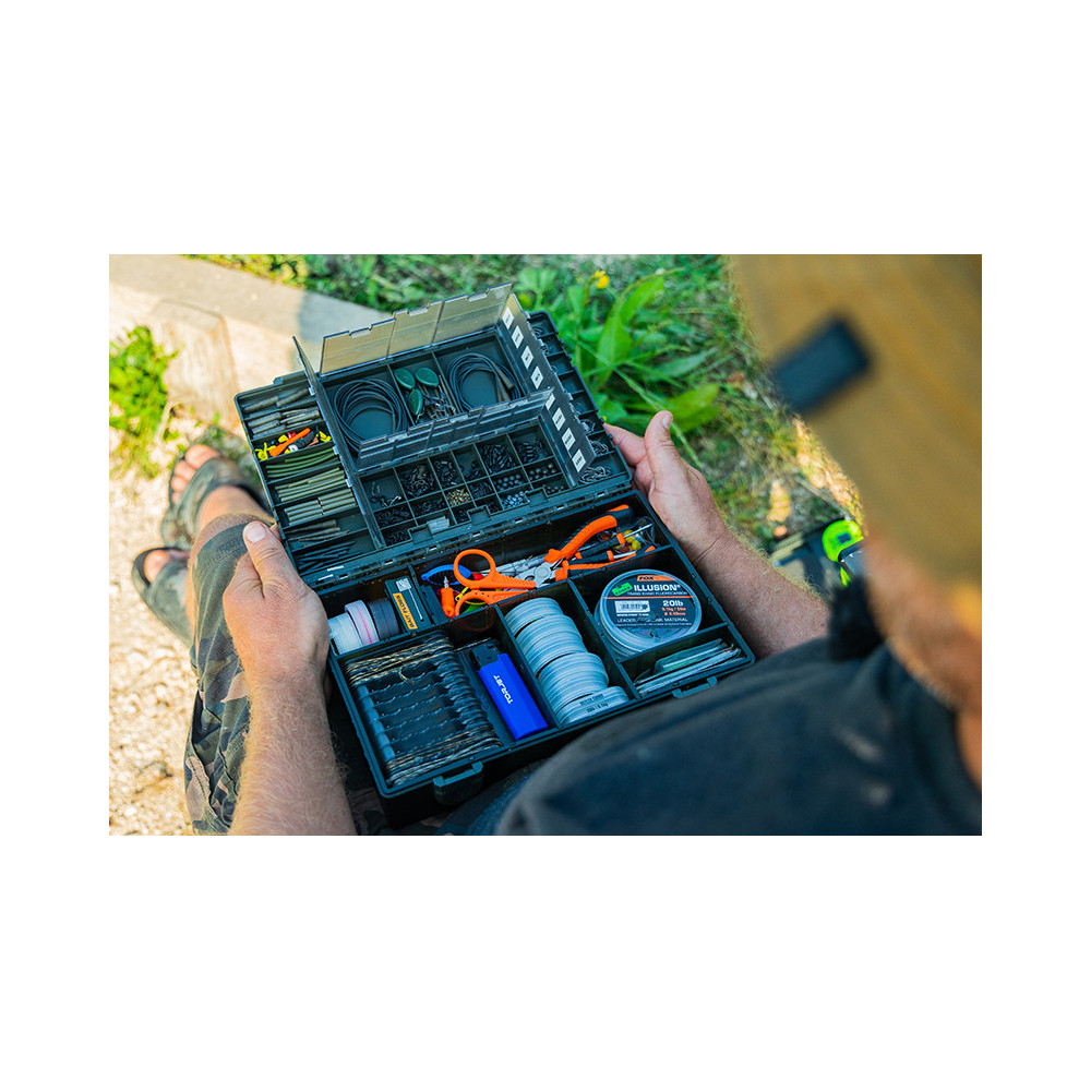 De basis van de Tackle Box is ontworpen voor de nieuwe binnendozen Standaard en XL, de verstelbare binnendozen, de haakdozen en de nieuwe Leader Racks, ook in Standaard en XL. De doos bevat 3 lange, 2 korte en 1 middelgrote verdeler. Deze verdelers zijn afneembaar en maken het mogelijk om uw doos te personaliseren. De inkepingen voor de bevestiging ervan zijn ontworpen om de bruikbare ruimte te maximaliseren en ervoor te zorgen dat er tijdens het vervoer van de doos geen speling is in de interne vakken van uw keuze. Al uw kleine spullen, van gereedschap tot spoelen braid of lijnkoppen, zijn volledig compatibel met de Tackle Box.
