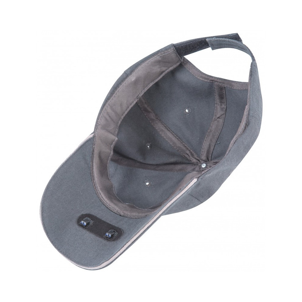 Pet met LED's onder het vizier voor gebruik 's nachts. Dit product is instelbaar met klittenbandsluiting en een compartiment voor de batterij die is verborgen in de hoofdband.