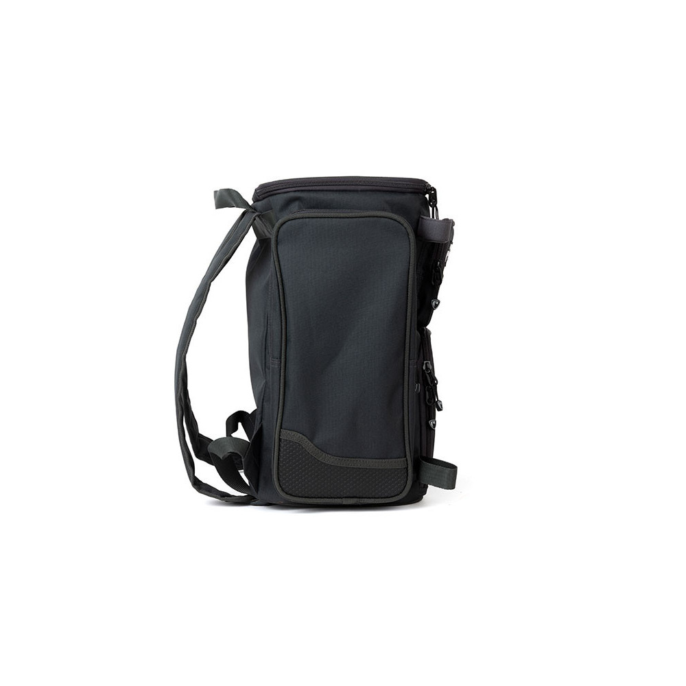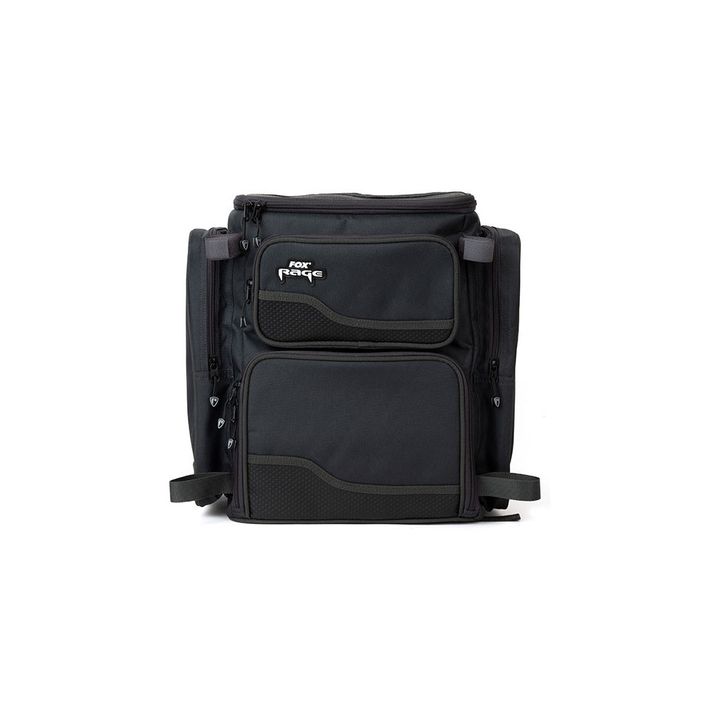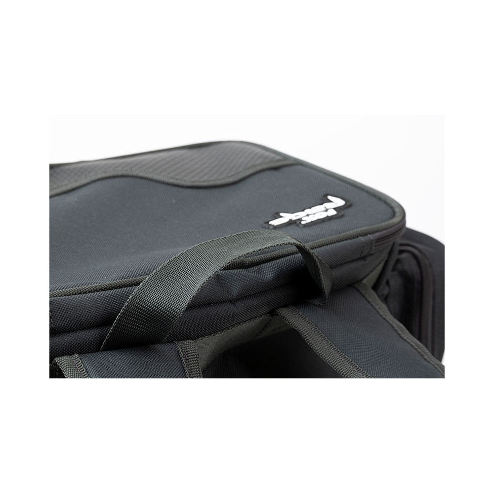 Grote tas met een centrale ruimte gevuld met kunstaasdozen, vier compartimenten en twee hengelhouders.