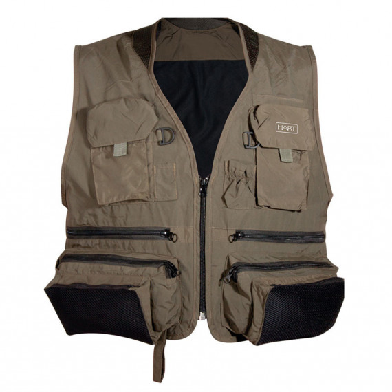 Multifunctioneel technisch visgilet, gemaakt van nylon. Snel droog. Elastische kraag. Intern gaas voor betere ademhaling. Buikband voor staven. 2 buikzakken met vakjes en ringen voor accessoires. 2 grote cargozakken met rits onderaan. 2 onderste zakken met rits voor dozen en kleinere zakken boven elkaar. Onderste riem voor het ophangen van de paal. Achterste accessoire ring. Grote achterzak.