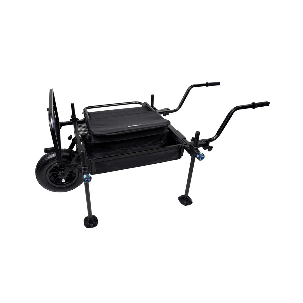 Om het bovenste gedeelte van de kruiwagen tijdens het vervoer te kunnen gebruiken, is de zitting op een verwijderbaar frame geplaatst. Het voordeel hiervan is dat hij zeer stabiel staat aan de waterkant, dankzij de 4 verstelbare poten met een diameter van 25 mm, die alle zijn uitgerust met anti-moddervoetjes. Het klemsysteem is robuust met klemknoppen waarmee het geheel kan worden afgesteld en vastgedraaid. Deze kruiwagen is uitgerust met een grote band (diameter 36 cm) en twee stevige armen van goede lengte die eindigen in een rubberen handvat.